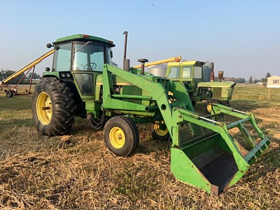JD 4040 2WD TRACTOR - WILL NOT GO INTO "B" RANGE w/ SHOWING 7643 HRS, QUAD TRANSMISSION, 540/1000 PTO, 2 HYDRAULICS,JOYSTICK, ADJUSTABLE AXLES, BRAND NEW FRONT TIRES, JD FEL w/ 85" BUCKET, GRAPPLE, SILAGE SCREEN, HEAT, AC, RADIO, REAR WHEEL WEIGHTS s/n 4040H008625R LOTS 1 TO 4 ARE GROUPED TOGETHER, THIS DOES NOT MEAN YOU HAVE TO BUY ALL LOTS IN THIS GROUP, BUT THE BIDDING WILL REMAIN OPEN ON ALL THE LOTS UNTIL THERE ARE NO MORE BIDS ON ANY LOT AT THEIR CLOSING TIME. |