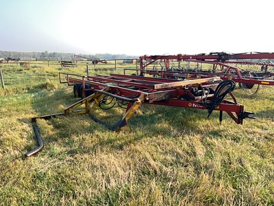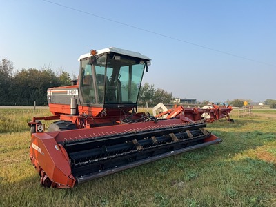 HESSTON 8400 S/P 16' HAYBINE w/ SHOWING 4318 HOURS, CUMMINS ENGINE, HEAT, A/C, RADIO, ADJUSTABLE AXLES, UII PICK UP REEL, 21' HESSTON 820D SWATHER HEADER, PLASTIC FINGERS. HAYBINE 840H- s/n 61406 SWATHER 820D- 80420 TRACTOR s/n- 02100 |