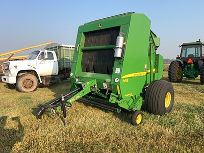 JD 568 RD BALER w/ APPROX 22,921 BALES, SMALL 1000 PTO, NET & TWINE, MEGA WIDE PLUS PICK UP, 21.5L-15.1 SL FLOATION TIRES, MONITOR s/n E00568X347002 |